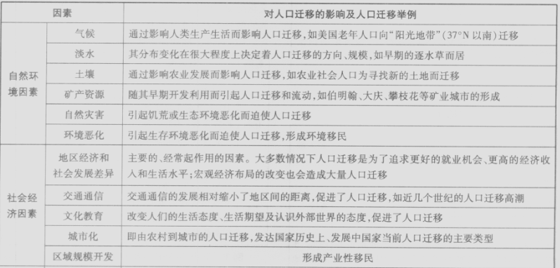 (1)自然环境因素:是影响人口迁移的基础因素。例如,美国部分老年人在退休以后由东北部“冷冻地带”向西部、南部“阳光地带”迁移,主要受气候条件影响;随着大庆油田、攀枝花铁矿、金昌镍矿等的开发,吸引大量人口迁人,主要受矿产资源的影响;近代山东、河北大量人口闯关东,主要受土地条件的影响。
