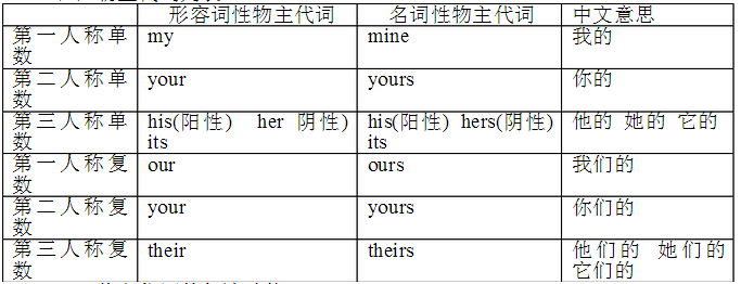 (1)表示所有关系的代词叫物主代词。物主代词分为形容词性物主代词和名词性物主代词两种。物主代词有人称和数的变化。第三人称单数的物主代词还有性的变化。