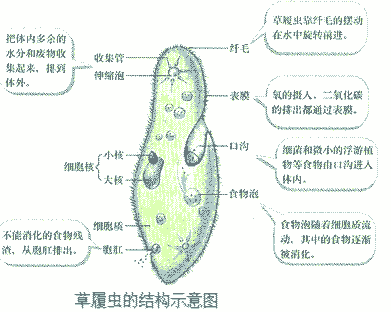 一种身体很小、圆筒形的原生动物。最常见的是草履虫,体长只有80~300微米。因为它身体形状从平面角度看上去像一只倒放的草鞋底而叫做草履虫。草履虫全身由一个细胞组成,身体表面包着一层膜,膜上密密地长着许多纤毛,靠纤毛的划动在水里运动。它身体的一侧有一条凹入的小沟,叫“口沟”,相当于草履虫的“嘴巴”。口沟内的密长的纤毛摆动时,能把水里的细菌和有机碎屑作为食物摆进口沟,再进入草履虫体内,供其慢慢消化吸收。残渣由一个叫肛门点的小孔排出。草履虫靠身体的外膜吸收水里的氧气,排出二氧化碳。常见的草履虫具有两个细胞核:大核主要对营养代谢起重要作用,小核主要与生殖作用有关。