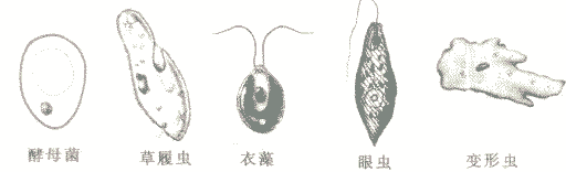 酵母菌,草履虫,衣藻,眼虫,变形虫。