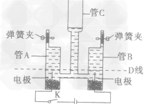 (1)用一个大瓶子,截去瓶底,留瓶口一段约高8~10cm。瓶口配一胶塞,由里向外塞紧。用镀铬曲别针伸直一段由塞子上扎出,在瓶塞露头处连接导线,做成电解槽如下图I。