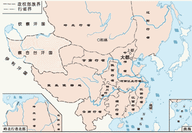 元代疆域辽阔,战争频繁,为了便于管理,元代在地方实行了行省制度。即除设置中央一级的中书省(统辖山东、山西、河北和内蒙古等地)外,又将全国划分成十个大的地方行政区域,每个行省下设路,府、州、县四级地方行政机构。元代行省置丞相、平章、左右丞、参知政事等官职,由中书省直接派出官吏任职,凡一省的军国大事无所不领,并且行政长官直接对中书省负责。行省辖区不仅地域辽阔,且省界犬牙交错,使其无山川险阻可依,北向门户洞开,形成以北制南的军事控制局面。