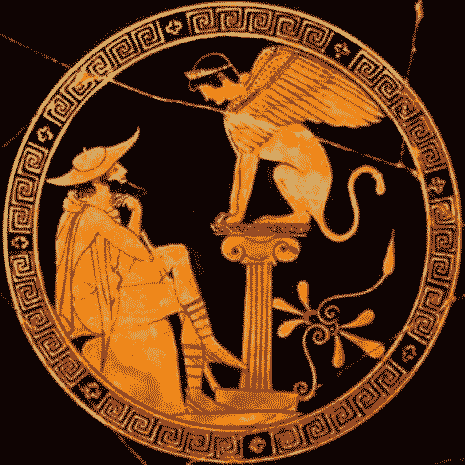 俄狄浦斯是希腊神话中忒拜的国王,他在不知情的情况下,杀死了自己的父亲并娶了自己的母亲,因此遭到诅咒,他的儿子俄狄浦斯出生时,神谕表示他会被儿子所杀死,为了逃避命运,拉伊奥斯刺穿了新生儿的脚踝,并将他丢弃在野外等死。然而奉命执行的牧人心生怜悯,偷偷将婴儿转送给科林斯的国王波吕波斯,由他们当作亲生儿子般地扶养长大。俄狄浦斯长大后,因为德尔菲神殿的神谕说,他会弑父娶母,不知道科林斯国王与王后并非自己亲生父母的俄狄浦斯,为避免神谕成真,便离开科林斯并发誓永不再回来。俄狄浦斯流浪到忒拜附近时,在一个岔路上与一群陌生人发生冲突,失手杀了人,其中正包括了他的亲生父亲。当时的忒拜被狮身人面兽斯芬克斯所困,因为他会抓住每个路过的人,如果对方无法解答他出的谜题,便将对方撕裂吞食。忒拜为了脱困,便宣布谁能解开谜题,从斯芬克斯口中拯救城邦的话,便可获得王位并娶国王的遗孀约卡斯塔为妻。后来正是由俄狄浦斯解开了斯芬克斯的谜题,解救了忒拜。