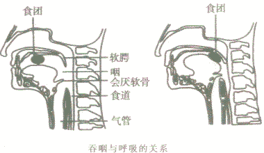 (3)喉:既是呼吸通道,又是发声器官。喉由多块软骨绀成,其中会厌软骨形似树叶,上宽下窄。在做吞咽运动时,咽与喉上提,会厌软骨可掩盖喉口,防止食物进入喉腔。呼吸时,会厌软骨像抬起的盖子,使空气畅通无阻。有的人边吃饭边说笑,在咽时会厌软骨来不及盖下,食物进入气管,就会引起剧烈的咳嗽。