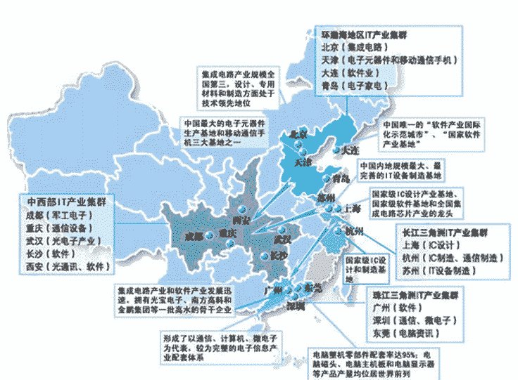 北京、上海已成为我国高新技术产业的核心。珠江三角洲、沪宁杭、京津石(石家庄)因具备工业基础、科技力量雄厚、高层次知识性人才集聚、交通便利、对外开放程度高等有利因素,已开始形成高新技术产业带,随着西部大开发战略的实施,我国中西部的武汉、重庆、西安、兰州等地正日益成为中西部地区的高新技术产业中心。