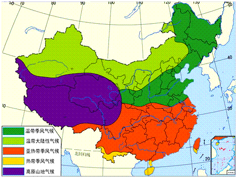 我国根据≥10℃积温自北向南划分五个温度带,即寒温带、中温带、暖温带、亚热带、热带,同时另有一个独特的青藏高原气候区。