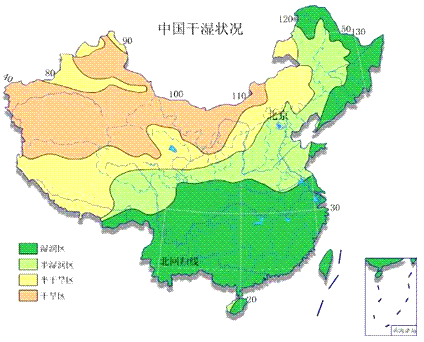 | 空间分布规律 | 从东南沿海向西北内陆逐渐渐少 | 影响我国降水的主要来源是夏季风。我国东部广大地区受东南季风和西南季风的影响大,降水多;西北内陆地区受夏季风影响不明显,降水稀少 | 东南部湿润,愈向西北部内陆越干燥 | |