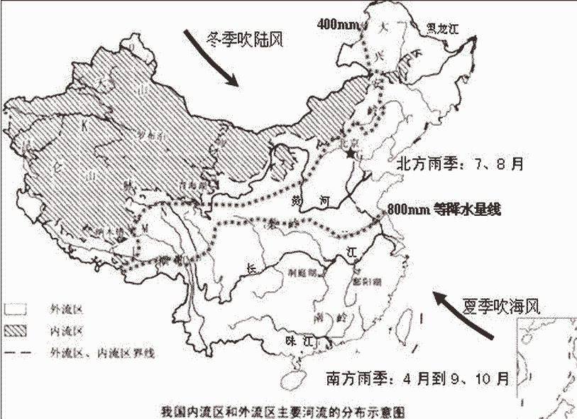 | 降水的南北差异 | 北方:降水少,雨季短;南方:降水多,雨季长。 | 由夏季风形成锋面雨带进退规律决定的。 | 形成北方的春旱、夏涝;江淮地区的梅雨和伏旱。 | |