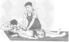 对于心跳停止的病人,应在进行人工呼吸的同时做胸外心脏挤压,如图l273所示。挤压时,救护者站在病人左侧,双手叠放在一起,有节奏地、带冲击性地用力向下按压病人的胸骨下端,使其下陷3~4厘米,然后放松。一般每做一次人工呼吸,需做4~5 次心脏挤压,如此反复进行。当病人出现自主呼吸,颈动脉有搏动,脸色逐渐红润时,证明抢救有效。