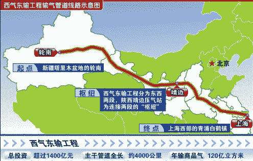 西起新疆轮南,东至上海,途径新疆、甘肃、宁夏、陕西、陕西、河南、安徽、江苏、上海9省区。实施西气东输工程,有利于促进我国能源结构和产业结构调整,带动东西部地区经济共同发展,改善长江三角洲以及沿线地区人民生活质量,有效治理大气污染。为西部大开发,将西部地区的资源优势变为经济优势创造了条件,对推动和加快新疆以及西部地区的经济发展,具有重大的战略意义。