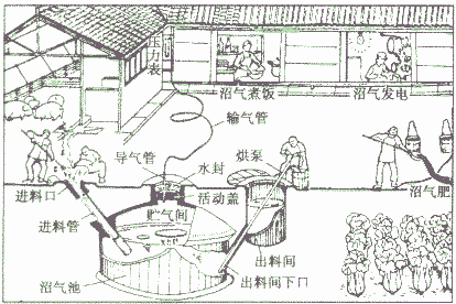把秸秆、杂草、人类粪便等废弃物放在密闭的沼气池中发酵,就可以产生甲烷。如图:
