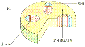 (1)每根导管都是由许多长形、管状的细胞组成,上下细胞间的细胞壁已经消失,形成了一根中空的管道导管是中空的长管与根叶脉中的导管连在一起可输送水分和无机盐;筛管可运输有机物;在木质部和韧皮部之间有形成层,形成层细胞不断分裂使茎不断长粗。