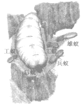例如,白蚁群体成员之间有明显的分工,群体中有雌蚁、雄蚁、工蚁和兵蚁。工蚁的职能是筑巢,喂养雌蚁、雄蚁和兵蚁。兵蚁则专司蚁穴的保卫。雌蚁是专职的“产卵机器”,也叫后蚁,有时它的腹部膨胀得很大,与身体其他部分很不相称,而且自己不能移动,由工蚁负责移开雌蚁产下的卵并加以照料。