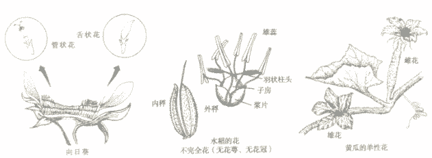 不完全花:在一朵花中,花萼、花冠、雄蕊、雌蕊四部分缺少其中一至三部分的,叫作不完全花。如南瓜花、黄瓜花缺雄蕊或雌蕊;桑树花、栗树花缺花瓣、雄蕊或雌蕊;杨树花,柳树花缺萼片、花瓣、雌蕊或雄蕊。