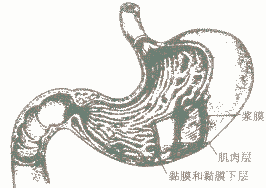 位于腹腔的左上方,是消化道最膨大的部分。胃呈囊状结构,由外至里依次由浆膜,肌肉层、黏膜下层,黏膜4层绀成,黏膜具有腺体,能分泌盐酸和胃蛋白酶等