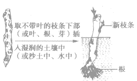 ①概念:扦插是指把能产生不定根的植物体的枝条剪下,将下端插进潮湿的土壤中,使枝条长成一个新个体的方法。杨、柳、葡萄、月季、蔷薇等植物常用这种方法进行繁殖。
