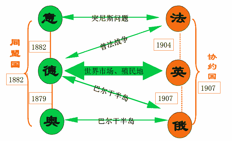 第二次工业革命以后,新型资本主义国家势力迅速发展,例如德国,要求重新分配殖民地。危及英法等老牌资本主义国家的利益,同时奥匈帝国和俄国因为克里米亚问题,亦存在矛盾,三国同盟的矛头指向俄国和法国,随着德国不断扩张以及英、德矛盾日趋尖锐,英国协调了与法国和俄国的关系,在1904年和1907年分别与法国和俄国签订协约,最后形成了三国协约。