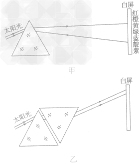 2.光的色散现象:一束太阳光通过三棱镜,被分解成七种色光的现象叫光的色散,这七种色光从上至下依次排列为红、橙、黄、绿、蓝、靛、紫(如图甲所示)。同理,被分解后的色光也可以混合在一起成为白光(如图乙所示)。