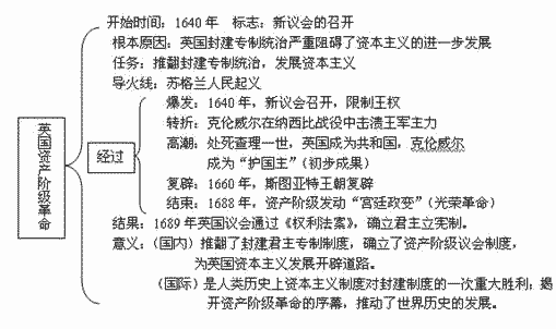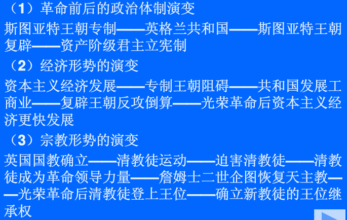 (3)封建王朝的复辟:1660年詹姆士二世复辟,1688年“光荣革命”,由于资产阶级和新贵族不满国王专制统治,发动了宫廷政变。国王的女儿玛丽和女婿威廉共同执政。