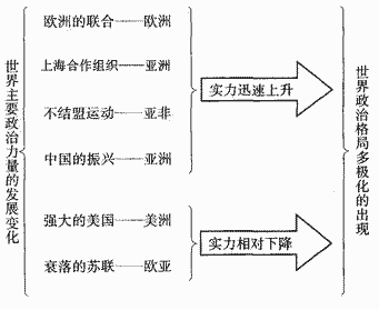 国际政治格局由两极向多极化的演变是战后世界历史运动的一种基本趋势,起始于20世纪50年代后期,具体表现为三个并行发展的历史进程:资本主义阵营由美国一家独大演变为美、欧、日三足鼎立;社会主义阵营从意识形态论战走向分裂;“第三世界”国家以不结盟运动的形式在国际政治舞台上发挥出制衡两极的作用。这些因素的合力推动着多极化趋势的发展。世界走向多极化是一个逐步演进的过程。