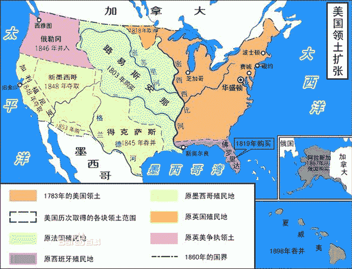 美国自1783-19世纪中叶先后通过4次领土扩张,由原有的200余万平方公里扩展到内战前的780万平方公里,5次扩张分别是:1812年通过英美战争划分美国的东北边界;1810-1835年间强占西属的佛罗里达和德克萨斯;1846年美墨战争获得加利福尼亚地区;1804年从法国购得路易斯安娜;1867年以后购得阿拉斯加并强占夏威夷。