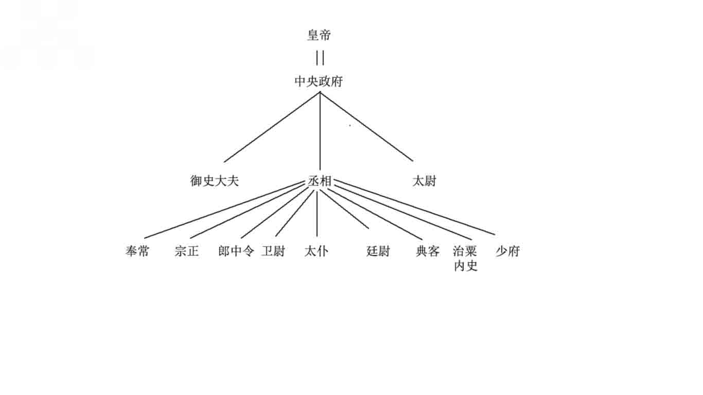 三公:在中央设立丞相、御史大夫和太尉三个最高官职。丞相帮助皇帝处理全国政事;御史大夫执掌群臣奏章,下达皇帝的诏令,并负责监察百官;太尉负责掌管理全国军务。