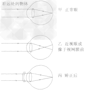 近视跟的远点为有限距离,近点也比正常眼近。因此,患近视眼的人习惯紧贴在书上看字。由于眼球在前后方向上太长,视网膜距品状体过远,或者晶状体比正常眼凸一些,变得太厚,折射光的能力太强,从无限远处射来的平行光线不能会聚在视网膜上,而会聚点成在视网膜前(如图乙)。矫正近视眼,可配戴用凹透镜制成的近视眼镜(如图丙),使入射的平行光线经凹透镜发散后再射入眼睛,会聚点就能移到视网膜上。