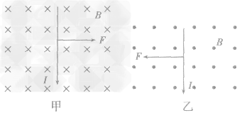 比较图(a)、(b):磁感线方向相同,都是垂直纸面向里,电流方向相反,受磁场力方向也应相反,(a)图向左,则(b)图向右。