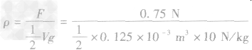 解析:木块漂浮,所受浮力等于重力,F=G= Mg=p木Vg=0.6×103kg/m3×0.125×10-3m3× 10N/kg=0.75N,盐水的密度: