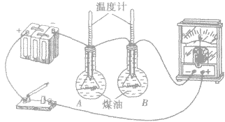 (2)B瓶中温度计升高得快,说明相同时间内煤油吸收的热量多,由于镍铬合金丝电阻大于铜丝电阻,所以在电流和通电时间相同时,导体电阻越大,产生的热量越多。