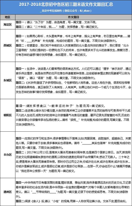 北京各区期末考已落下帷幕,今天收集了各区期末语文试卷,并将语文作文题目进行了汇总分析,来和北京中考在线一起看看吧。