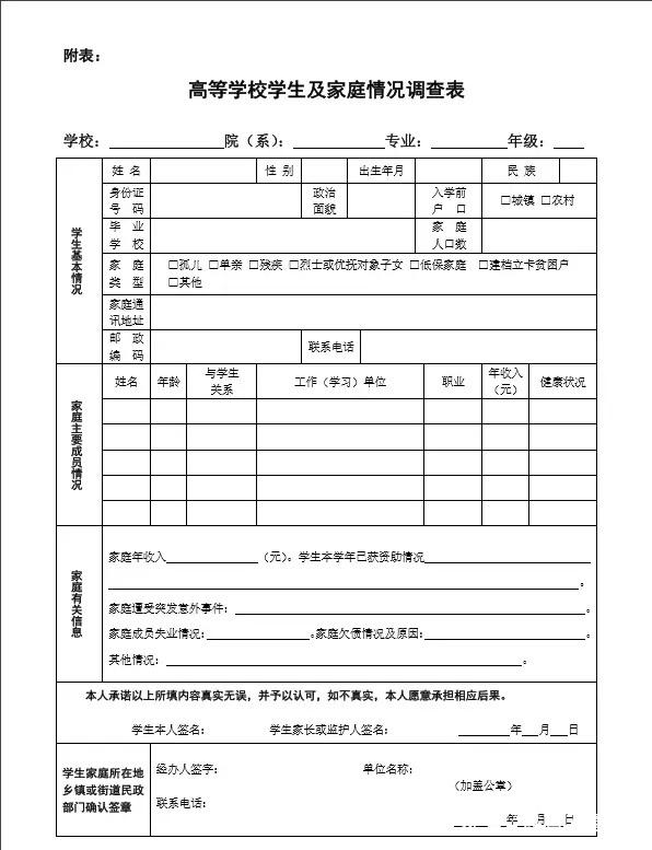 一般通知书里都会有五样重要的东西:一张录取通知书、学校银行卡、电话卡、学生手册(或地图)以及一张很重要的家庭经济状况调查表。而今天要说的主角就是这张比家庭经济情况调查表:样式如下图所示: