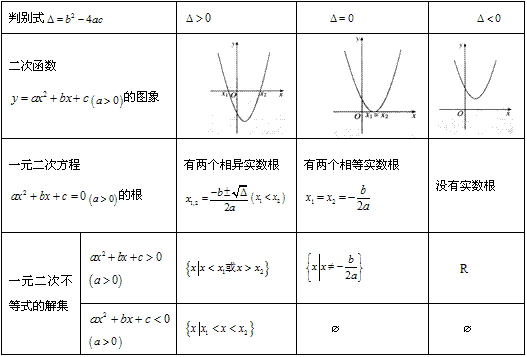 二次函数的图象、一元二次方程的根、一元二次不等式的解集间的关系: