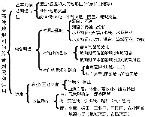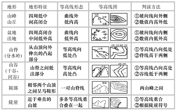 (1)水系特征:山地常形成放射状水系;盆地常形成向心状水系;山脊常形成分水岭(山脊处等高线弯曲最大处的连线称分水线);山谷常有河流发育,等高线穿越河谷时向上游弯曲,即河流流向与等高线凸出方向相反。