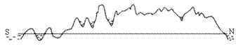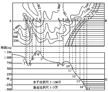 确定地形剖面图的垂直比例尺及水平比例尺是绘图中的难点及重点,垂直比例尺一般是原图的5、10、15、20倍,倍数越大,起伏越明显。水平比例尺一般与原图一致。在新图中绘水平线MN,按水平比例尺的大小定出剖面范围为横坐标,按垂直比例尺的大小,绘出纵坐标。