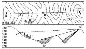 直视问题可以通过作地形剖面图进行判断,在地形剖面图上由观测点的投射点向目标点的投射点绘直线,若直线没有被任何地物所切断,表示直视良好,否则不能直视。如下图所示,由点s′向点c′绘直线,直线没有被任何地物所切断,表示直视良好。而图中b′位于阴影区,说明s点不能直视b点,所以村落b对于s点为不直视。