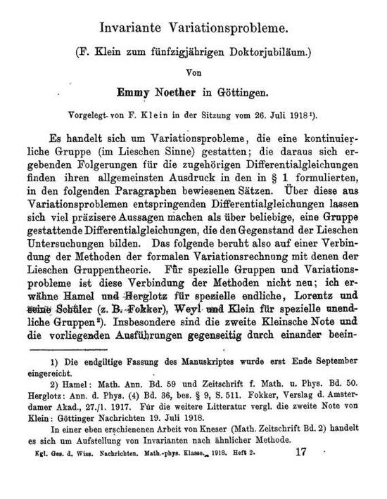 1918年,艾米·诺特发表了论文 Invariante Variationsprobleme,她在论文中证明了诺特定理。(图片来源:Wikipedia) 1918年,艾米·诺特发表了论文 Invariante Variationsprobleme,她在论文中证明了诺特定理。(图片来源:Wikipedia)