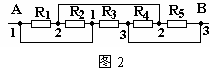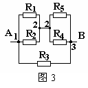 解析:按从A到B的顺序把5个电阻分成R1、R2、R3、R4、R5,其节点标示如图2所示。由于节点R2、R3间和A点是用导线相连,这两点是等势点,故两节点可用同一个数字1标出,当电流从A点流入时可以同时流向电阻R1、R2、R3,从电阻R1和电阻R2流出的电流汇合于2点,到达R4和R5间的节点,故R4和R5间的节点也用2标出,R3、R4间的节点和B点间是导线相连,也是等势点,故均用3标出,电流再从电阻R4和电阻R5经节点3流出,而流向电阻R3的电流则直接经节点3流出,简化后其等效电路如图3所示。
