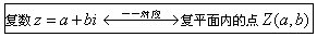 点Z的横坐标是a,纵坐标是b,复数z=a+bi(a、b∈R)可用点Z(a,b)表示,这个建立了直角坐标系来表示复数的平面叫做复平面,x轴叫做实轴,y轴叫做虚轴。显然,实轴上的点都表示实数,除原点外,虚轴上的点都表示纯虚数
