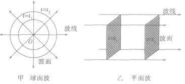 ①波面:波源引起的振动在介质中向各个方向传播,如果把某一时刻振动状态相同的点连接起来组成一个面,这个面就叫波面或波阵面