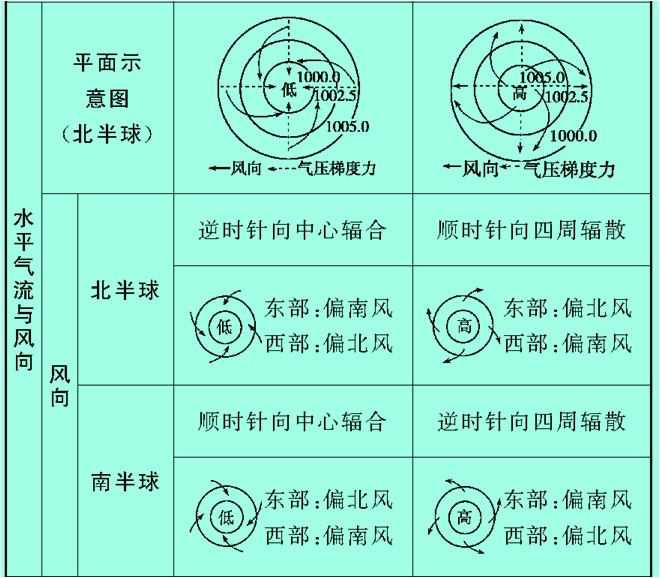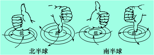 气旋、反气旋的低空水平气流运动方向可以用左右手定则进行判断: