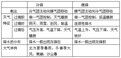 ①冷锋:过境时,常出现大风、阴天、降水、降温的天气;过境后气温、湿度降低,气压升高,天气转晴。