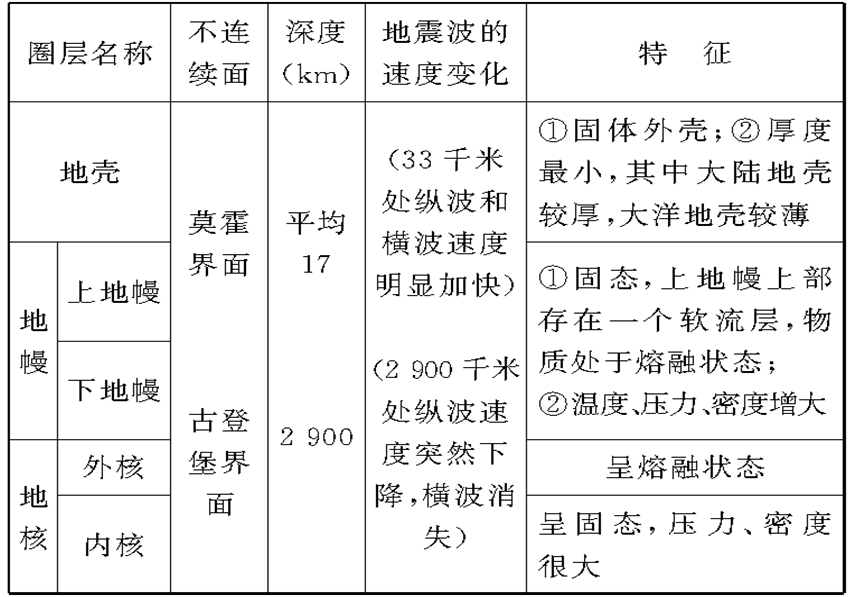 | 地核 | 古登堡面以下 | 组成物质可能是极高温度和高压状态下的铁和镍。可分为内核和外核;外核物质呈液态或熔融状态,内核呈固态。 |