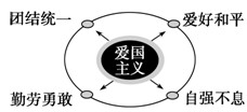 以爱国主义为核心,团结统一、爱好和平、勤劳勇敢、自强不息。