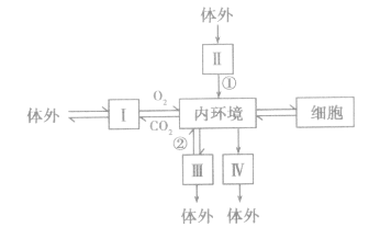 I是体内外进行物质交换的系统,并能为内环境提供02并排出CO2,这说明I是呼吸系统,内环境与 I交换气体必须通过肺泡壁和毛细血管壁;如果Ⅱ内的葡萄糖通过①只能进入血液,那么Ⅱ为消化道,①表示主动运输;Ⅲ是泌尿系统,②表示重吸收作用;皮肤有保护的作崩,皮肤中的汗腺通过分泌汗液来排出代谢废物,Ⅳ表示的器官是皮肤。
