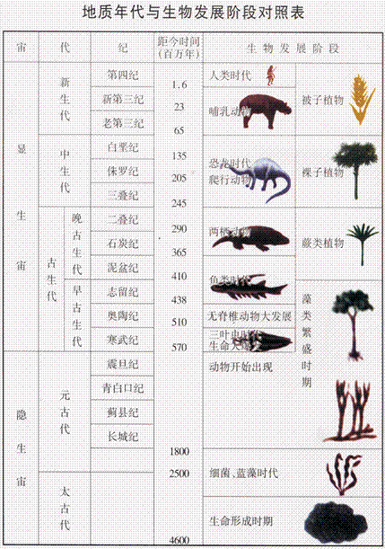 元古代——出现陆地。有藻类等低等生物,原始生命开始。