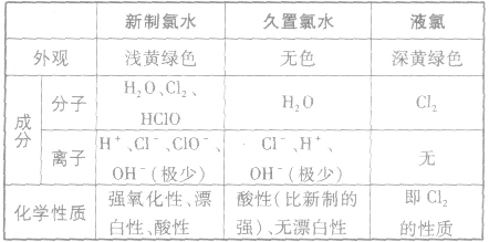 。所以,在氯水中存在三种分子:Cl2、 H2O、HClO;四种离子:H+、Cl-、ClO-及少量OH-。由于在光照条件下HClO可分解