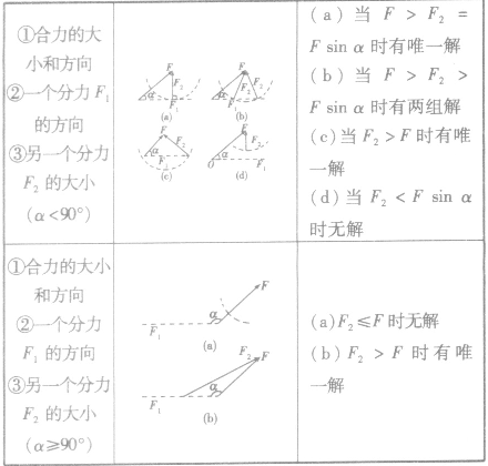 。若F<F1时,则另一个分力F2与合力F间夹角无极值,可在0。~180。之间变化:当F1与F同向时分力F2与合力F之间夹角最大,为180。;当F1与F反向时分力F2与合力 F之间夹角最小,为0。,但两分力间夹角有最大值,其最大值满足