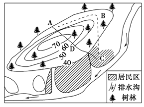 从A处修铁路到C处,经过B处坡度较缓,施工较易;而经过D处则坡度较陡,施工不易,增加建设费用,故应选择图中的虚线线路。