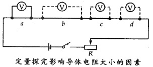图中四段导体是串联的,每段导体两端的电压与它们的电阻成正比,因此,用电压表分别测量a、b、c、d两端的电压,就能知道它们的电阻之比。